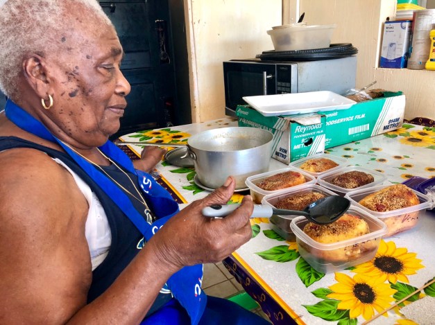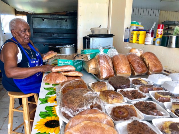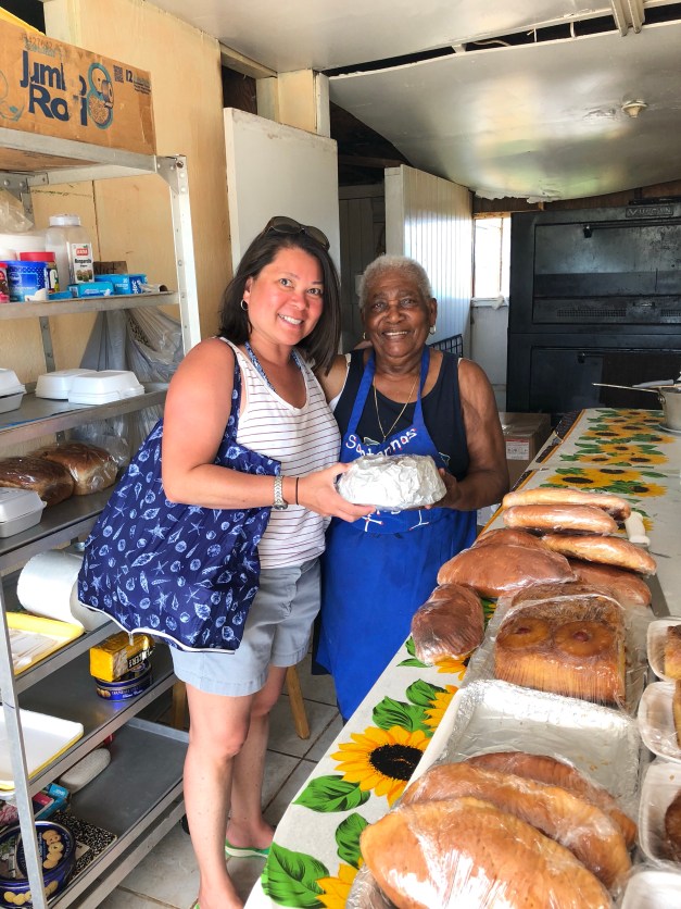 She tells us to grab the large cake without the rum sauce that she has baked for us to carry back home. She had given us the rum sauce recipe the other day and reminds us how to make it again so we can rum this cake at home. She also makes me take a coconut tart for a snack during the flight. She wouldn’t take no for an answer and she wouldn’t take payment for it. We do give her extra money when we pay for our lot of 6 small rum cakes and tell her to use the extra in her donation box. We love this woman. She has the heart of gold. She is loved dearly by everyone she meets.