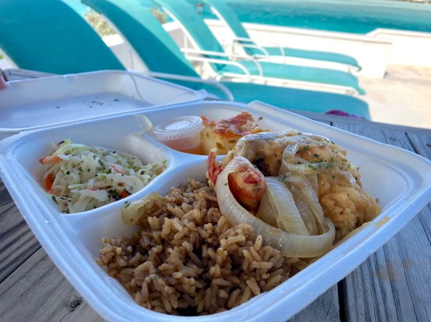 First order of the day was to go to town and gas up the car. Zoom on over to Mom’s Bakery to pick up the rum cakes that we ordered, and then a takeout lunch from Santanna’s. After lunch we were going to Moriah Cay.