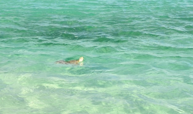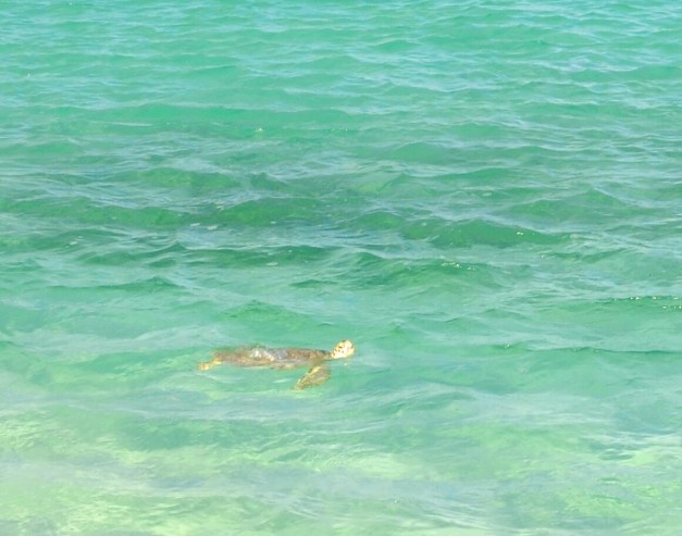 After the excitement died down, we continued to perfect the art of liming. Until… Hook yells, “Turtle! A turtle is coming!” We both ran to grab the cameras. This turtle is also big. We watch as it swims against the current, occasionally popping its head to take a breath of air.
